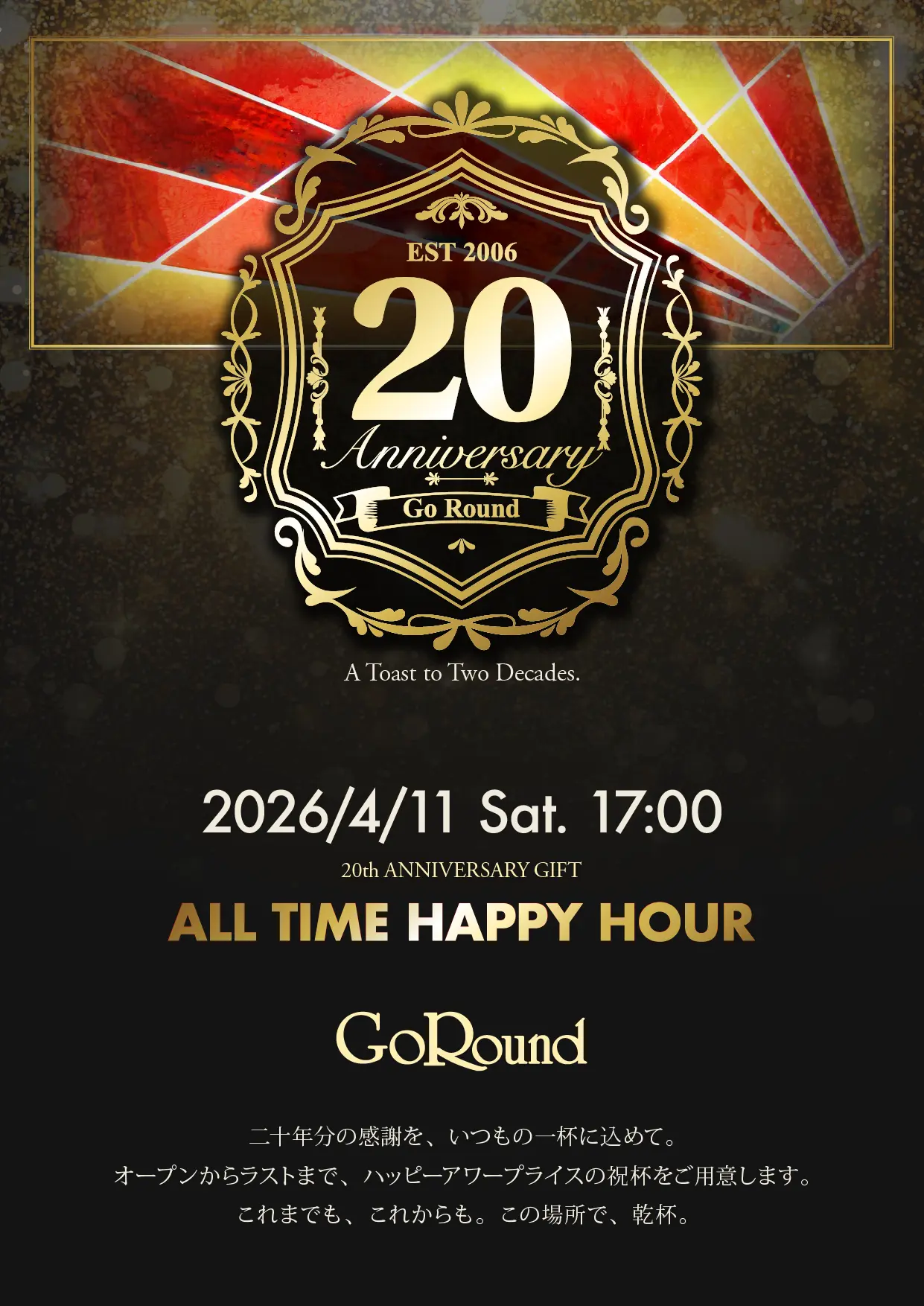 GoRoundは皆様のご愛顧に支えられて18年。そこで、来たる4/13 (土) は「ご愛顧感謝デー」といたしまして、一日中ハッピーアワープライスでお飲み物を提供します。ぜひ、お誘い合わせのうえお越しください。
