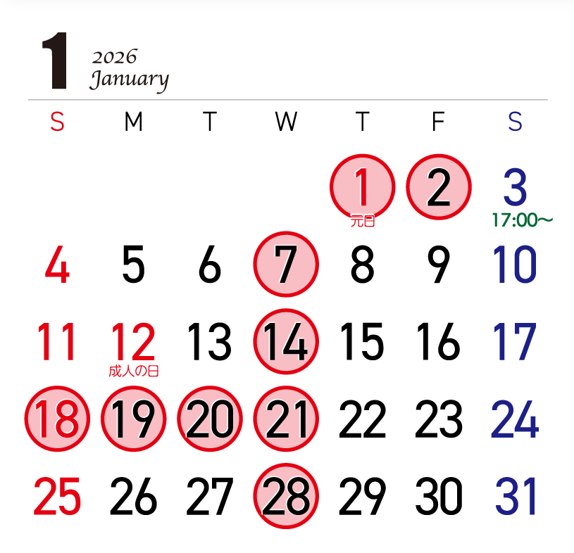 1 (木・祝), 2 (金), 7 (水), 14 (水), 18 (日), 19 (月), 20 (火), 21 (水), 28 (水)