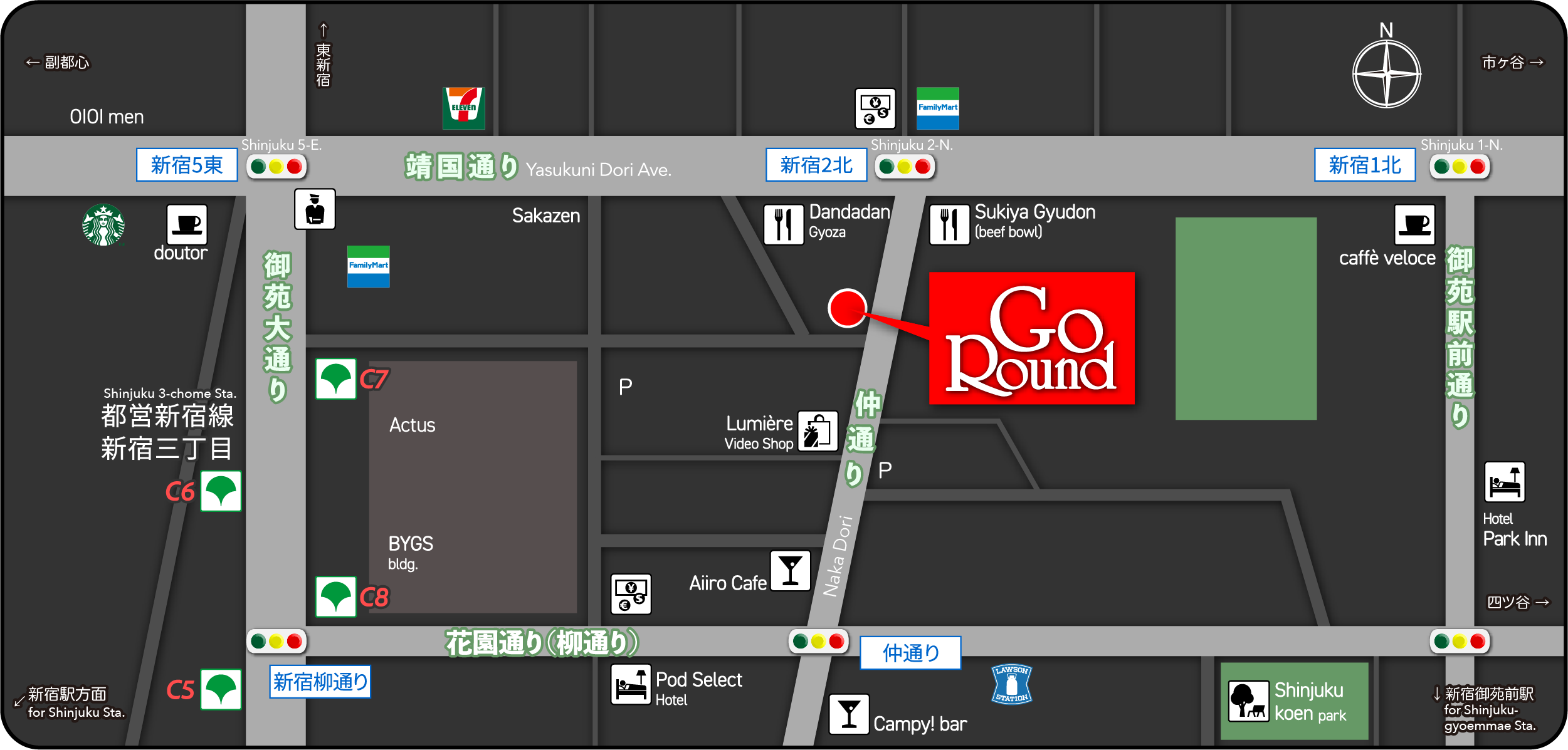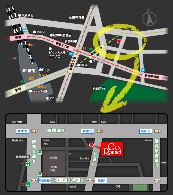 GoRoundは、靖国通りにほど近い、新宿二丁目の「仲通り」に面した1階にあります。新宿エリアの各駅から、徒歩で便利にお越しいただけます。
