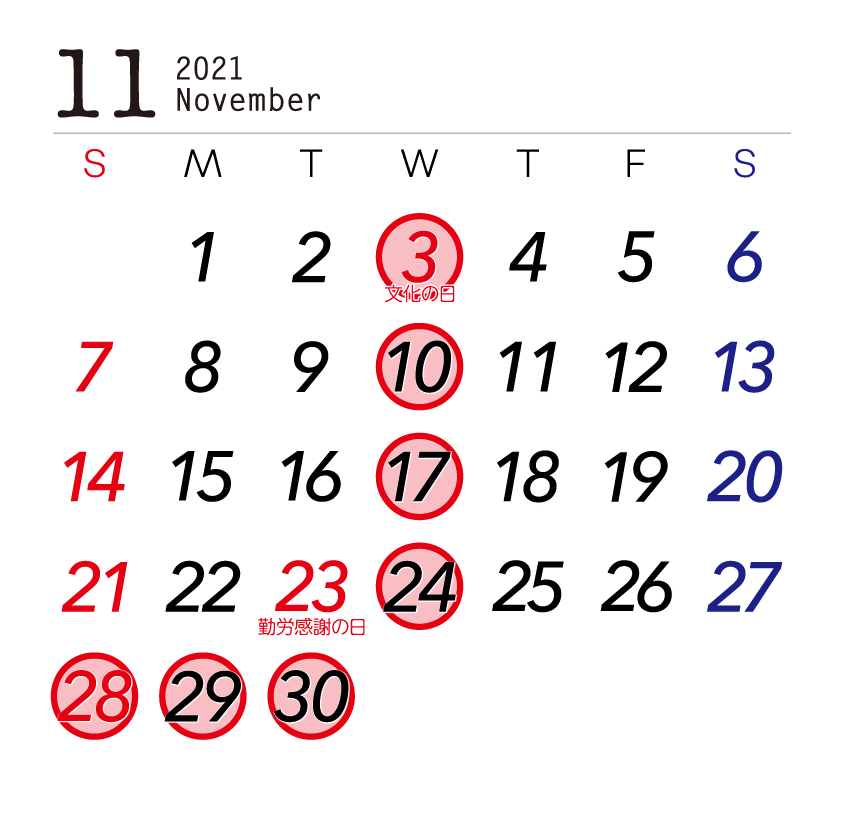 21日(日)は定休日にあたりますが、営業します。28日(日)、29日(月)、30(火)は臨時休業とさせていただきます。12月1日(水)の定休日と合わせて4連休致します。ご了承ください。