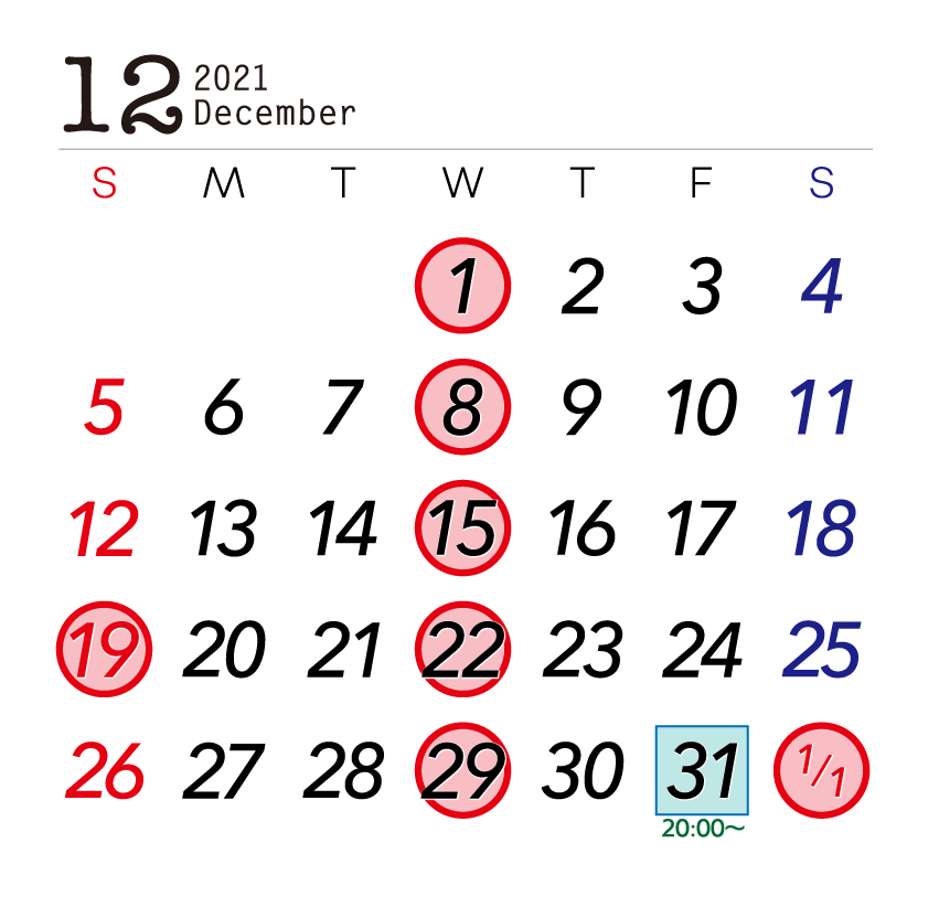 12月の営業カレンダーは、右のとおりです。年内は例月通りの定休日となっております。