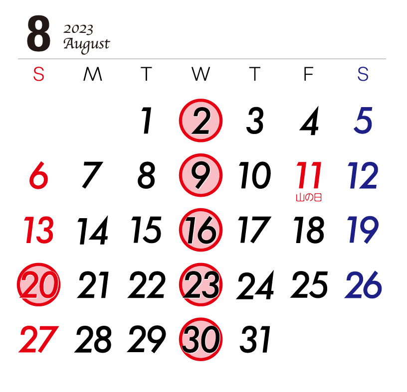 8月の営業は、右のように例月通りの定休日となっております。