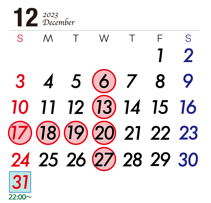 大晦日については、オープンが22時の特別営業とさせていただきます。