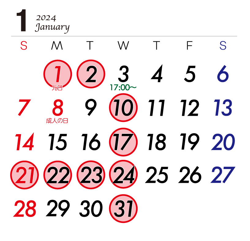 例年通り元日および2日(火)はお休みをいただき、新年は3日(水)より通常営業いたします。